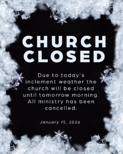 Due to the inclement weather we are experiencing today (January 15, 2026) the church will be closed for the remainder of the day and will re-open tomorrow morning. All ministry has been cancelled for today.